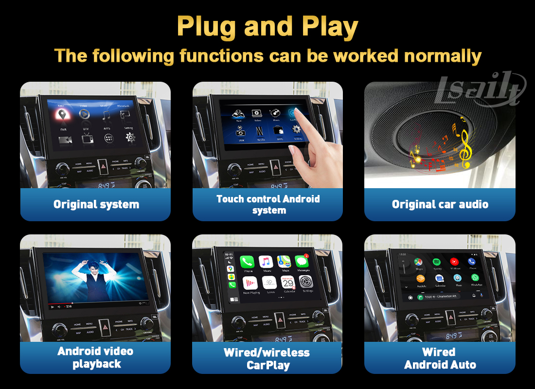 It’s a multimedia interface box without monitor.It integrates to OEM screen and radio.Lsailt interface is connected to the plugs behind of monitor without interfering with the head unit. With this module, it is possible not only to use Yandex, Netflix , YouTube ,Navigator or Navitel with traffic jams in real time, but also to play videos, download applications and use USB drives. The Android interface box supports to connect additional equipment to the car through itself: various audio and video devices, a front view camera 360 cameras.